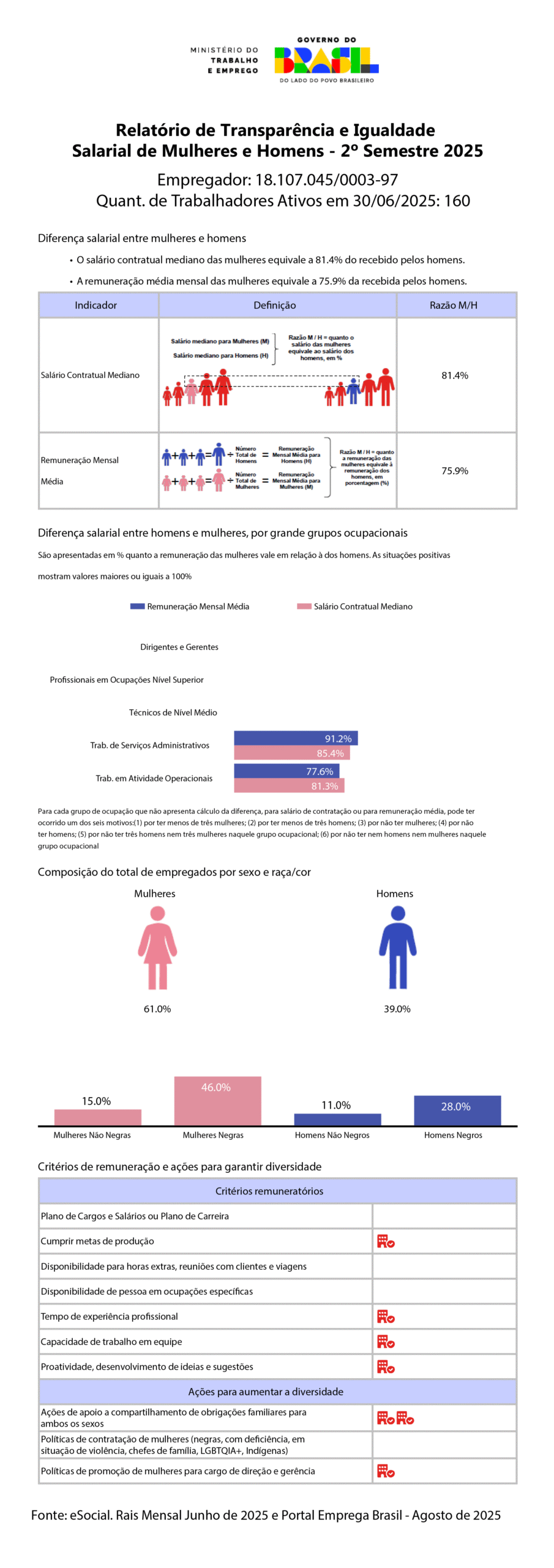 Relatório de Transparência e Igualdade Salarial de Mulheres e Homens – 2º Semestre 2025 Empregador: 18.107.045/0003-97 / Quant. de Trabalhadores Ativos em 30/06/2025: 160